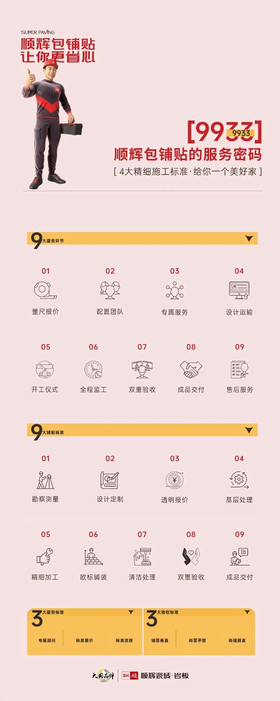 宁波嘿嘿视频在线瓷砖·嘿嘿连载污将通过落地嘿嘿视频在线包铺贴来进一步实现品牌推行成品交付式服务的愿景,从标准展陈、专业团队、专业工具以及工地形象等多个维度,为终端门店运营提供服务支持,从售前、售中、售后多个阶段为消费者提供更专业、更透明、更安心的服务。