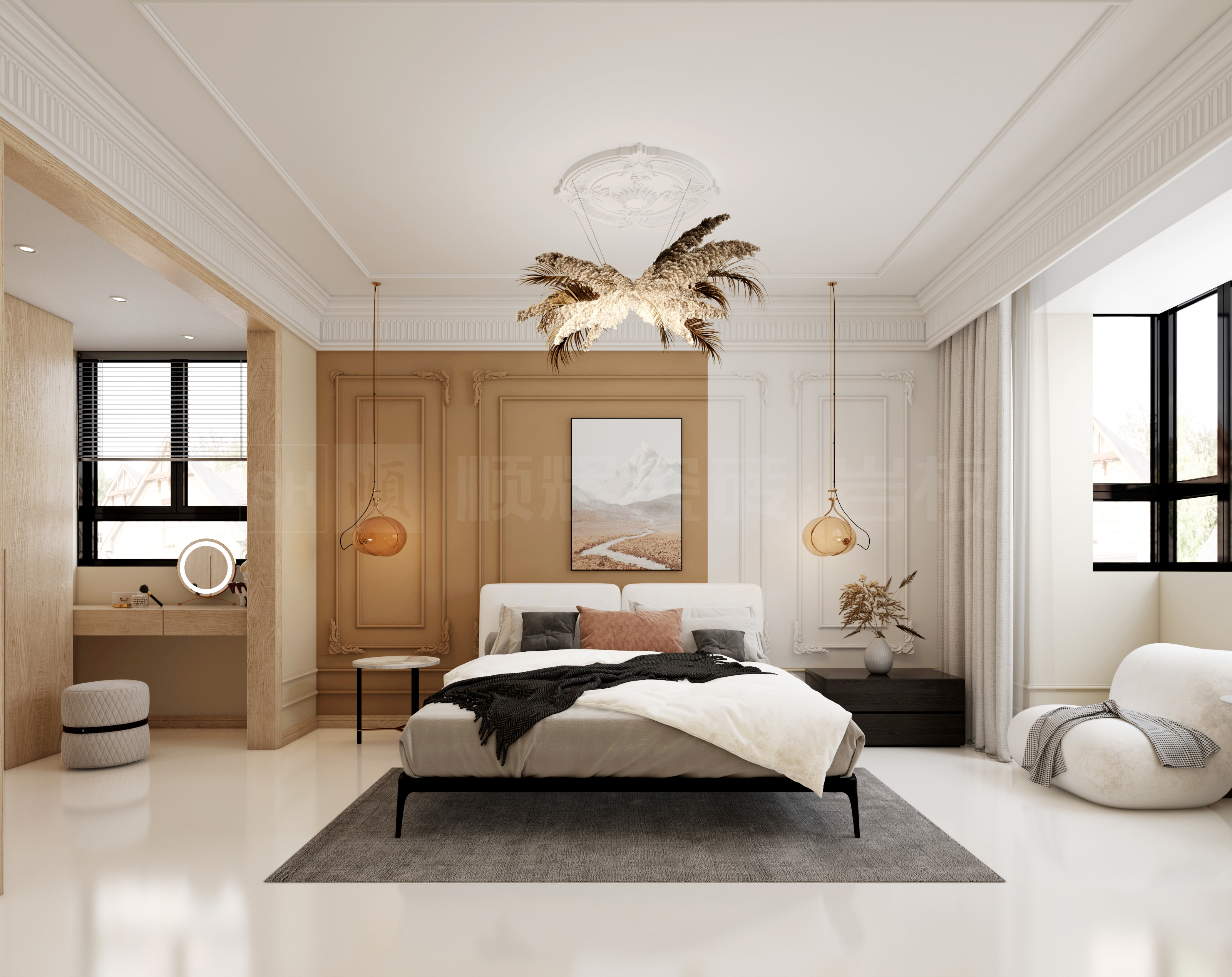 温馨浅黄+温润肤感的组合,自成一方静谧天地。以柜为墙围合出的开放式衣帽间,解锁卧室收纳功能,更好优化居者生活方式。